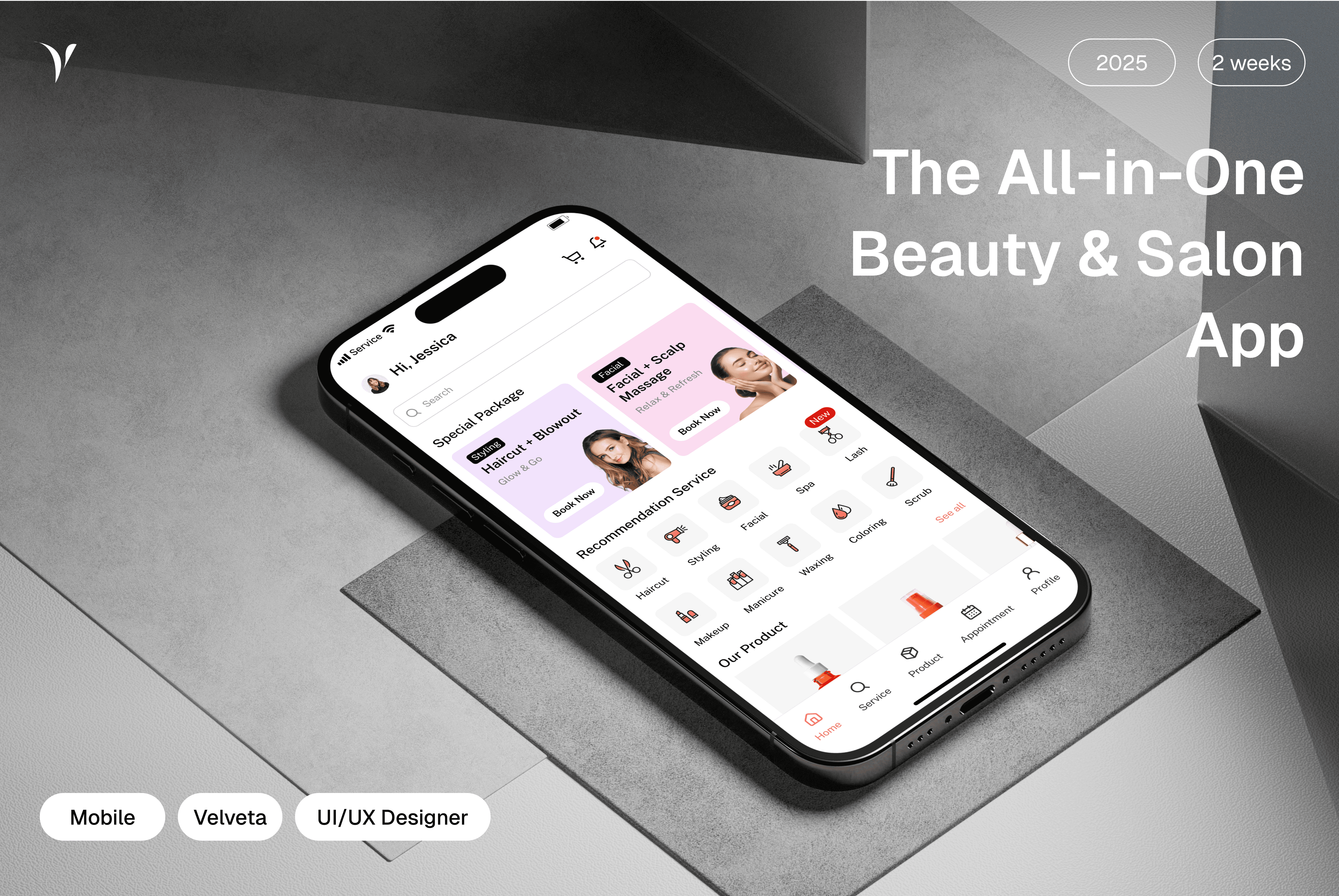 Velveta is a modern beauty salon & marketplace app designed to simplify how users book treatments, shop for beauty products, and access expert consultation — all in one place.